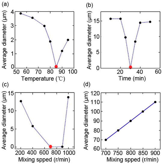 The average diameter of nano-SiO2·0.5H2O particles with the different (a) temperature, (b) time, (c,d) mixing speed with other reagents held at the standard conditions. The red hexagon indicated the average diameter of nanoparticles synthesized at the standard conditions. The average diameter at this point is 70 nm.