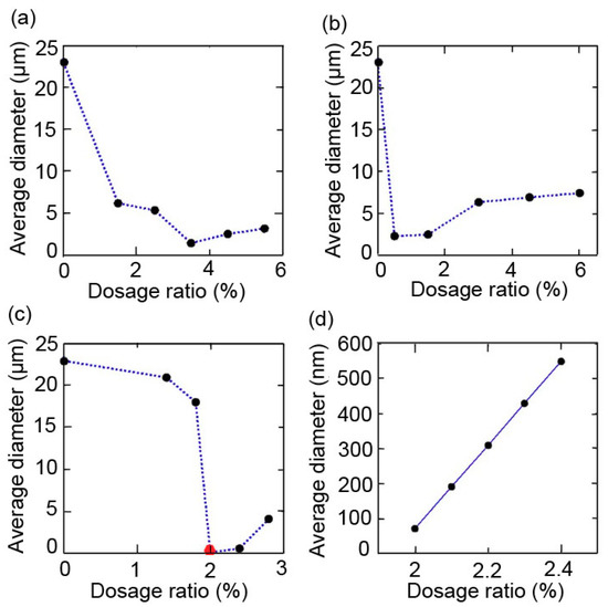 The silane coupling agent is the most used surface modifiers for WCB. Absorbed in the surface of WCB via the formation of a chemical bond, the surface energy of particles will be decreased and thus the agglomeration will be largely reduced. KH-550 (silane coupling agent) was used to replace SDBS in the synthetic process. As shown in Figure 4a, with the dosage ratio of 3.5%, the average diameter of WCB particles reached 1.42 μm with other reagents held at the standard conditions. It is clearly demonstrated that the nanoscale WCB particles cannot be achieved according adding KH-550. The same phenomenon happened to SDS. Although the SDS can control the nucleation of WCB particles and their growth by releasing large amount of negative charge hydrophilic groups, the nanoscale WCB particles cannot be achieved. As shown in Figure 4b, with the dosage ratio of 0.5%, the average diameter of WCB particles reached 2.26 μm with other reagents held at the standard conditions. However, the use of SDBS can achieve nano-SiO2·0.5H2O particles. With the dosage ratio of 2%–2.4%, the WCB nanoparticles were obtained with other reagents held at the standard conditions. Further study showed that dosage ratio of 2 % induced the minimum average diameter (Figure 4c,d). The SDBS can contribute to improving the wettability of particles so that their stability can be improved [28,29,30]. The increase of anion group in the surface of particles due to the attachment of SDBS can enhance the electrostatic repulsion and the steric hindrance, thus the stability of particles can be improved [31,32,33,34]. As a result, the dispersibility of WCB particles can be improved and the size of WCB particles can be reduced.