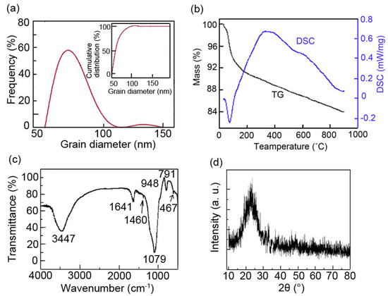 The nano-SiO2·0.5H2O particles were successfully synthesized and optimized through tailoring the preparation conditions. As shown in Figure 5a, the particle size of the optimized nano-SiO2·0.5H2O particles exhibits a narrow distribution, which ranges mainly between 55 and 110 nm and is centered on 70 nm. The gain diameter is less than 100 nm when the cumulative distribution reaches to 100% (see the insert of Figure 5a). TG-DSC curve, as shown in Figure 5b, demonstrates that the product possesses good thermostability as the residue rate is 83.09% at 900 °C. The FI-TR spectrum shows the characteristic peaks of WCB (475, 804, 960, 1107 cm−1), H2O (1633 cm−1) and SDBS (1460 cm−1), indicating the SiO2·nH2O particles are indeed synthesized and coated with SDBS (Figure 5c) [35,36]. The XRD pattern in Figure 5d demonstrates that the particles are in the amorphous phase, and the broad peak located at about 22˚ indicates the formation of SiO2·0.5H2O.