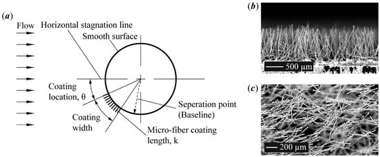 A microfiber coating having a hair-like structure has been paid attention for passive bluff-body drag reduction because its flexibility can produce a passive but adaptive influence on a flow, leading to drag and lift control. [,]. Hasegawa and Sakaue have investigated the application of microfiber coating by flocking technology to drag reduction on a cylinder []. In their study, it was found that drag was reduced due to delayed flow separation if the partial microfiber coating was applied before the point of flow separation. However, a drag reduction was not shown by the microfiber coating in the flow separation region. The microfiber length and the coating location were limited under their experiment. Further studies in microfiber length are necessary to reveal: (1) the correlation between microfiber length and coating location, and (2) the impact on drag by the microfiber coating in the separation region.