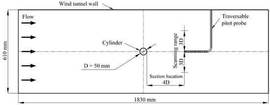 Figure 3 shows a schematic of the wake survey setup. Dynamic pressure, qwake, at 25 data points was scanned over a range that was ±3D in the vertical axis from the horizontal centerline of the cylinder. The interval of scanning points was 12.7 mm. A step motor traverse system with a step motor driver (PDO3540, Applied Motion Products, Watsonville, CA, USA) was used to vertically traverse the wake flow using a pitot-static tube. Wake measurements were performed at 4D downstream from the trailing edge of the cylinder. For the freestream measurement, a freestream dynamic pressure, q∞, was also measured at 4D upstream from the cylinder. To read dynamic pressures, a pressure transducer (DATUM 2000, Setra Systems, Boxborough, MA, USA) with a full-scale range of 0 to 127 mm of water column was used. It has an accuracy of ±0.14% of its full-scale reading. The output signal from the transducer was read by a DAQ system (DT9836, Data Translation, Marlborough, MA, USA) with 16-bit analog/digital channels. Each pressure measurement was sampled at 1 kHz for 10 s. Post-processed averaged data was used for the drag estimation.
