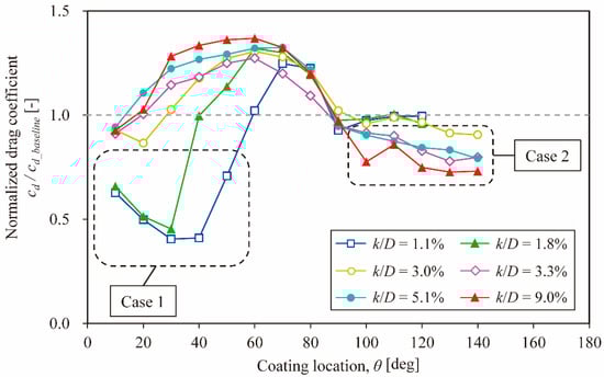 A potential reason for maximizing drag between 60° ≤ θ ≤ 70° would be due to the induced flow separation [,]. In this region, the baseline flow almost started to separate due to the flow acceleration under the adverse pressure gradient over a cylinder surface. The presence of the coating could enhance or trigger early flow separation which leads to a drag penalty. This severe drag penalty can be seen if the coating when the relative length of k/D > 3.0% is applied before the point of flow separation.