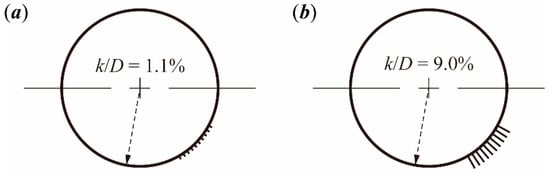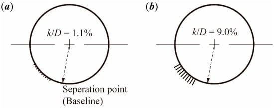The microfiber coating applied after the point of flow separation performed a drag reduction (see Case 2). However, it is still questionable that the mechanism is an enhancement of flow attachment which we expected the effect of the microfiber coating to be in the separation region []. The mitigation of shear layer and vortex circulation at the rear side of the cylinder would be one of the potential mechanisms. Interaction of the microfiber coating with a shear layer from the cylinder surface could lead to a drag reduction. The coating location in Case 2 corresponded to a flow separation region where a backflow and a shear layer were present []. Under the baseline flow, a periodic swirling by the backflow and the shear layer will be present at the rear side of a cylinder after the separation point. The lengthy microfiber coating at the rear side could interact with a shear layer or both shear layer and backflow depending on the microfiber length. It could mitigate a shear flow and vortex circulation due to the shedding vortices at the rear side of the cylinder. Figure 6 shows a schematic of a profile of a circular cylinder with microfiber coating at θ = 120°. In the view of topology, a longer fiber as shown in Figure 6b significantly changes a cylinder profile which has a larger effect on flow, while shorter fibers shown in Figure 6a seems to have little impact. As k/D increases, it can be expected that the microfiber coating interacts with the backflow in the wake with larger effect which leads to further drag reduction. The presence of such relatively long microfiber coatings at the leeward side of the cylinder also seems to be similar to a tab mounted on the trailing edges or a splitter plate on a bluff body which tend to attenuate Karman vortex shedding, resulting in drag reduction [].