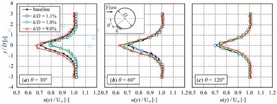 Comparison of mean velocity profiles in the wake for baseline and microfiber with relative length of k/D = 1.1%, 1.8%, and 9.0%: (a) θ = 30°; (b) θ = 60°; and (c) θ = 120°.