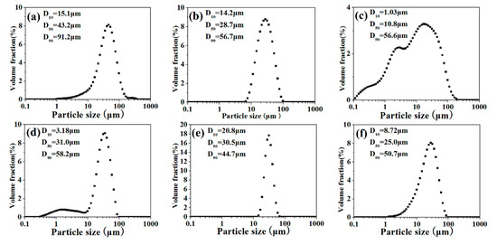 The particle size distribution of the powders: (a) Mo, (b) B, (c) Co, (d) Cr, (e) Ni, and (f) Ti.