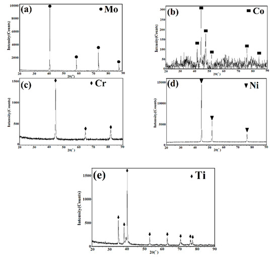 The phase compositions of the powders: (a) Mo, (b) Co, (c) Cr, (d) Ni, and (e) Ti.