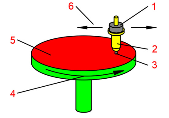 Schematic diagram of pin-on-disk wear testing: (1) weight, (2) clamp, (3) sample, (4) rotating direction of the disk, (5) abrasive paper, and (6) moving direction of the sample.