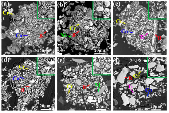 The surface and cross-sectional morphologies of mixture powders (a,d) Mo–B–Co–Cr; (b,e) Mo–B–Ni–Cr; and (c,f) Ti–B–Co–Cr respectively.