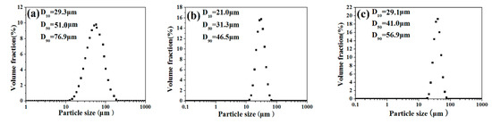 Figure 1 shows the surface and cross-sectional morphologies of all of the powders. Commercially available pure powders, including Mo (99.9 wt %, D10 = 15.1 μm, D50 = 43.2 μm, D90 = 91.2 μm; Beijing DK Nano Technology Co., Ltd., Beijing, China), B (99.9 wt %, D10 = 14.2 μm, D50 = 28.7 μm, D90 = 56.7 μm; Beijing DK Nano Technology Co., Ltd., Beijing, China), Co (99.9 wt %, D10 = 1.03 μm, D50 = 10.8 μm, D90 = 56.6 μm; Beijing DK Nano Technology Co., Ltd., Beijing, China), Cr (99.9 wt %, D10 = 3.18 μm, D50 = 31.0 μm, D90 = 58.2 μm; Beijing DK Nano Technology Co., Ltd., Beijing, China), Ni (99.8 wt %, D10 = 20.8 μm, D50 = 30.5 μm, D90 = 44.7 μm; BGRIMM Advanced Materials Science and Technology Co., Ltd., Beijing, China), and Ti (99.9 wt %, D10 = 8.72 μm, D50 = 25.0 μm, D90 = 50.7 μm; Beijing DK Nano Technology Co., Ltd., Beijing, China) were used as raw materials in this study. The particle size distribution of the powders is shown in Figure 2. Figure 3 shows the phase compositions of the powders; the phase composition of B powder cannot be displayed because B is a light element. Four kinds of pure powders, such as Mo, B, Co, and Cr; Mo, B, Ni, and Cr; or Ti, B, Co, and Cr were mixed by ball milling method at a rotation speed of 200 rpm for 3 h to prepare Mo–B–Co–Cr, Mo–B–Ni–Cr, or Ti–B–Co–Cr mixture powders. The ball to powder weight ratio was 10:1. Then, the mixture powders, which were agglomerated in polyvinyl alcohol (PVA) binder solution, were crushed and sieved after drying to obtain the necessary thermal spraying particles. The details matching the mixture powders are shown in Table 1. The size distribution of pure and mixture powders were measured by a laser diffraction meter (Malvern Mastersizer 2000, Malvern instrument Ltd., Scotland, UK).
