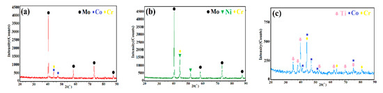 The X-ray diffraction (XRD) patterns of mixture powders (a) Mo–B–Co–Cr, (b) Mo–B–Ni–Cr, and (c) Ti–B–Co–Cr.