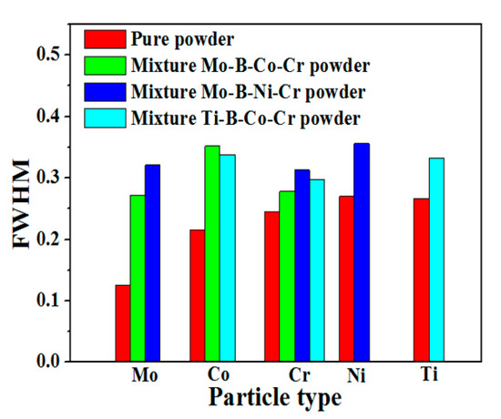Full widths at half maximum (FWHMs) of Mo, B, Co, Ni, Cr, and Ti peaks in the pure and mixture powders.