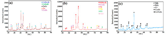 XRD patterns of the boride-based coatings: (a) MoB/CoCr, (b) MoB/NiCr, and (c) TiB/CoCr.