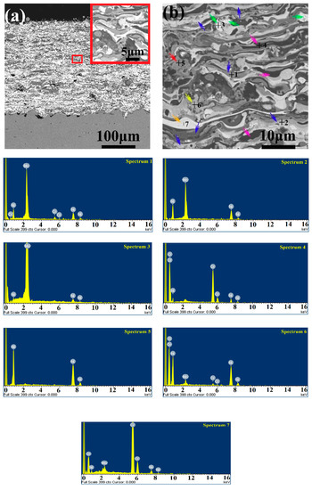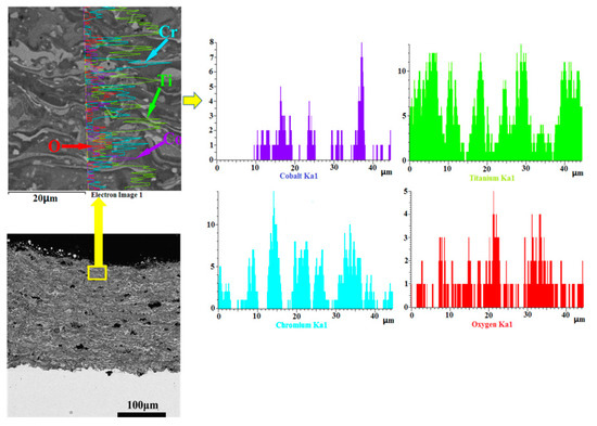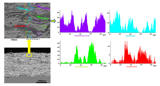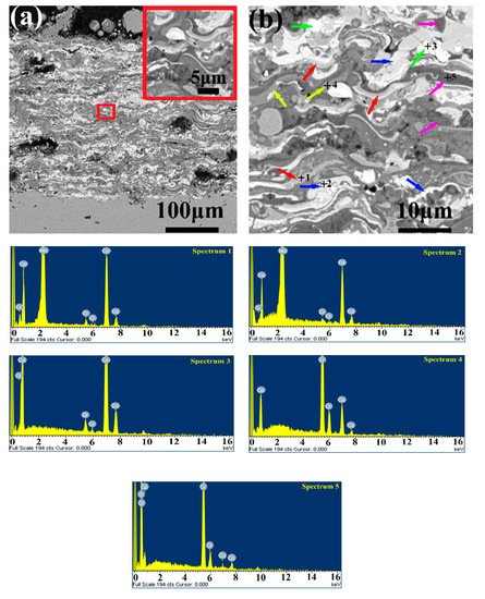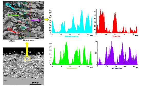 Figure 11, Figure 12 and Figure 13 show the cross-sectional, backscattered SEM morphologies and compositions of the three kinds of the coatings. The typical lamellar structure of thermal spraying was present in the coatings (as shown in Figure 11b, Figure 12b and Figure 13b). The average porosities of MoB/CoCr, MoB/NiCr, and TiB/CoCr coatings were 1.67%, 0.811%, and 1.39%, respectively. This clearly illustrates that the MoB/NiCr coating presented a denser microstructure than the other two coatings. Furthermore, there were no obvious micro-cracks among the phases in the coatings (as shown in Figure 11b, Figure 12b and Figure 13b) and between the coating and the substrate (as shown in Figure 11a, Figure 12a and Figure 13a). This reveals that the melted Mo–B–Co–Cr, Mo–B–Ni–Cr, or Ti–B–Co–Cr mixture powders (as shown in Figure 6) impacted on the surface of the substrate or pre-coating to form the well-bonded, flattened particles, which could fill the pores in the coating and consequently tamp the coating to decrease the porosity. The average thickness of the MoB/CoCr, MoB/NiCr, and TiB/CoCr coatings was 315.94 ± 4.53, 290.58 ± 3.32, and 325.35 ± 14.49 μm, respectively.
