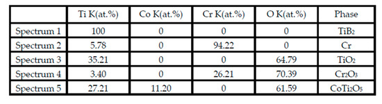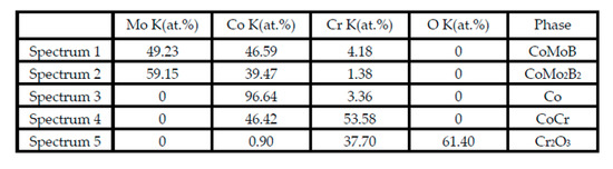 In order to clearly determine the compositions of the coatings, the various phases compositions were analyzed by EDS. Like the XRD analysis results, the EDS analysis revealed that CoMoB and CoMo2B2 ternary borides (Spectrum 1 and 2, and as indicated by the red and blue arrows, respectively, in Figure 11b) were generated in the MoB/CoCr coating, but the original pure Co (Spectrum 3 and as indicated by the green arrow in Figure 11b) was still present in the coating. Furthermore, it was found that a CoCr alloy (Spectrum 4, and as indicated by the yellow arrow in Figure 11b) and Cr2O3 (Spectrum 5, and as indicated by the purple arrow in Figure 11b) were formed in the MoB/CoCr coating. The same EDS analysis carried out on the MoB/NiCr coating revealed that the NiMo2B2 phase (Spectrum 1 and 2, and as indicated by the blue double-arrow in Figure 12b) was in situ synthesized, and oxides (Cr2O3 and NiO) (Spectrum 4 and 6, and as indicated by the purple and yellow double-arrow, respectively, in Figure 12b) were formed in the coating. According to EDS analysis, it was found that the TiB2 phase was also in situ synthesized in the TiB/CoCr coating (Spectrum 1, and as indicated by the red hollow arrow in Figure 13b), and more types of oxides (TiO2, Cr2O3, and CoTi2O5) were generated in this coating. By comparing the cross-sectional morphologies of the three kinds of the coatings (as shown in Figure 11a, Figure 12a and Figure 13a), the boride contents of the coatings were shown in Figure 14. The results showed that the average boride contents of the MoB/CoCr, MoB/NiCr, and TiB/CoCr coatings were 33.68 ± 0.78, 41.30 ± 3.05, and 36.88 ± 1.52 vol %, respectively.
