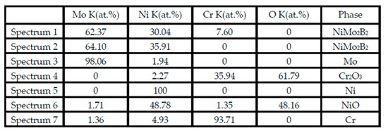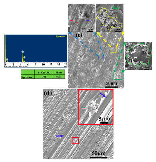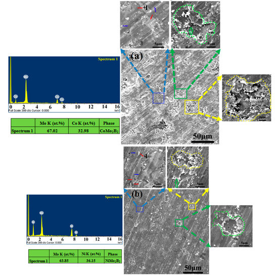 Furthermore, the groove formation mechanism of the boride-based coatings in this study was similar to that reported in [34,35,36,37]. According to the XRD and EDS analysis results of the boride-based coatings (as shown in Figure 10, Figure 11, Figure 12 and Figure 13), some metal phases with low microhardness (e.g., Co, Ni, or Cr) retained in the coatings could be preferentially and easily removed by SiC abrasive grits to form grooves. Ji et al. [35] reported that the metal binder phases around the carbide hard phases were preferentially worn off, and the carbide phases exposed to the surface because of the successive removal of binder phase could effectively improve the wear resistance. Kumari et al. [36] also reported that the higher the volume fraction of WC hard phases in the coating, the lower the loss of the softer binder phase; hence, the hard phases are believed to facilitate the formation of fine grooves on the worn out surface of the coatings [37]. In this study, TiB2, CoMoB and CoMo2B2, or NiMo2B2 borides (as indicated by the red arrow and analyzed by EDS in Figure 17) were in situ synthesized in the TiB/CoCr, MoB/CoCr, and MoB/NiCr coatings, respectively. The high microhardness of borides could withstand the applied effective load to improve the wear resistance. Hence, the wear resistance of the boride-based coatings was obviously higher than that of 316L stainless steel. Furthermore, the depth and width of grooves on the worn-out surface of the coatings were decreased as the volume fraction of borides increased. Figure 19 shows the average crater content of the worn-out surface of the coatings. This illustrates that the MoB/CoCr coating had the highest crater content of the worn-out surfaces among the coatings. The reason for this is that the weak interfacial bonding of various phases caused by the larger pores and higher porosity in the MoB/CoCr coating could easily generate more micro-cracks (as indicated by the green hollow arrow) during abrasive wear. The coating materials are easily peeled off to form more craters under the combined action of the propagation of cracks and load. Meanwhile, particles with weak interfacial bonding easily fall off of the coating to form pits. Hence, the highest weight loss of the MoB/CoCr coating was expected under such conditions, and MoB/NiCr has the best wear resistance property.