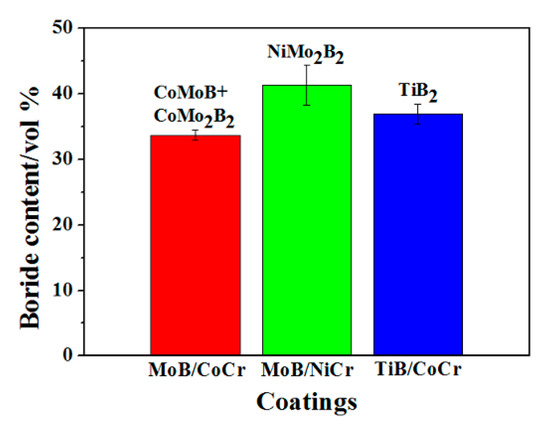 - From the combined XRD and EDS analysis results, it can be found that the CoMoB, CoMo2B2, NiMo2B2, and TiB2 borides were in situ synthesized in the MoB/CoCr, MoB/NiCr, and TiB/CoCr coatings, respectively. The average boride contents of the MoB/CoCr, MoB/NiCr, and TiB/CoCr coatings were 33.68 ± 0.78, 41.30 ± 3.05, and 36.88 ± 1.52 vol %, respectively.