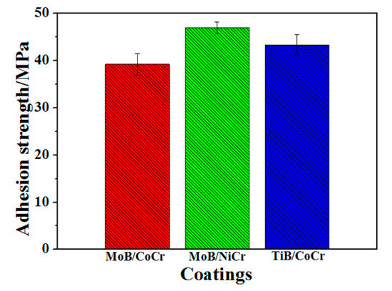 Figure 16 shows the bond strength of the MoB/CoCr, MoB/NiCr, and TiB/CoCr coatings. Compared with the MoB/CoCr and TiB/CoCr coatings, the MoB/NiCr coating had the highest bond strength (46.99 ± 1.20 MPa), due to the lowest porosity. However, the bond strength values of the three kinds of the boride coatings were lower than that of the conventional HVOF sprayed cermet coatings (e.g., WC–Co, WC–CoCr, NiCr–Cr3C2, etc.) [29,30,31,32,33]. Wang et al. [31,32] and Li et al. [33] reported that the conventional state parameters (e.g., temperature, velocity, and momentum, etc.) were not the direct influencing factors on improving the bond strength of HVOF-sprayed coatings; the more effective mass of the solid phases in a solid–liquid two-phase process were more effective in generating dynamic pressures. (Please check if meaning retained.) In addition, the high bond strength (over 70 MPa) of HVOF-sprayed WC–Co cermet coatings was owing to the physical bonding and mechanical interlock. In this study, the melted mixture powders (Mo–B–Co–Cr, Mo–B–Ni–Cr, and Ti–B–Co–Cr) impacted on the surface of the 316L stainless-steel substrate or pre-coating to form flattened particles (as shown in Figure 11, Figure 12 and Figure 13). No solid phases existed in the coatings, and they could not generate dynamic pressures to form physical bonding during spraying.