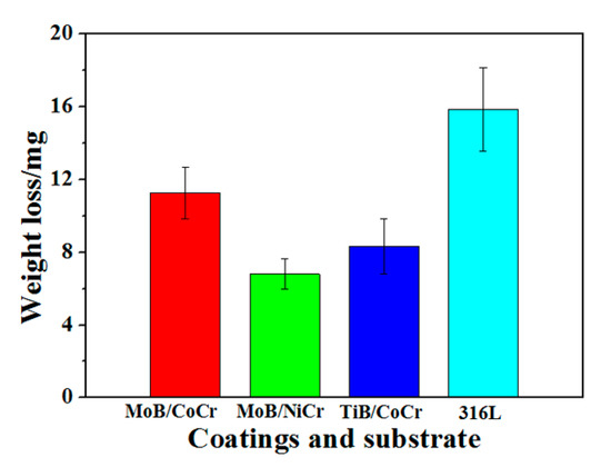 - The weight loss of the MoB/CoCr, MoB/NiCr, and TiB/CoCr coatings was 11.25 ± 1.4, 6.8 ± 0.84, and 8.33 ± 1.5 mg, respectively. The weight loss value of the 316L stainless steel substrate (15.86 ± 2.3 mg) was more than two times that of the MoB/NiCr coating.