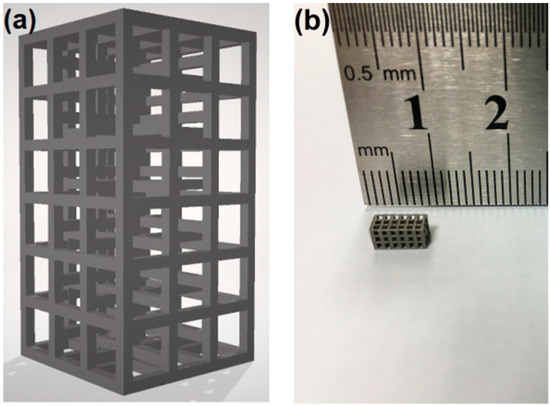 (a) Computer design model of rectangular a SLM-Ti scaffold and (b) a manufactured SLM-Ti scaffold.