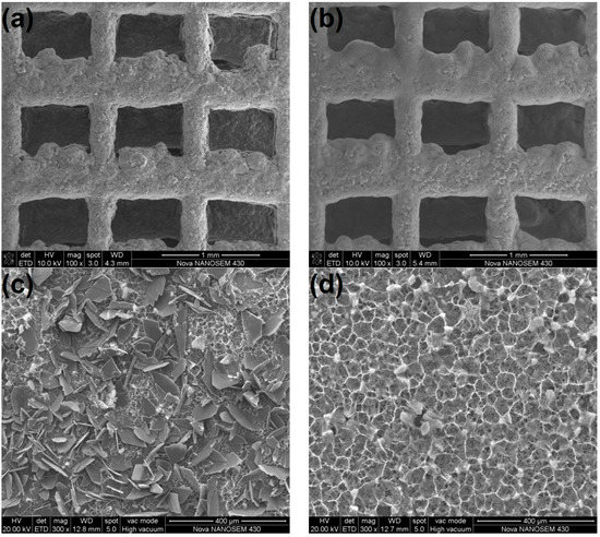 Scanning electron micrographs of coated SLM-Ti scaffolds: (a,c) the top surface and (b,d) the bottom surface.