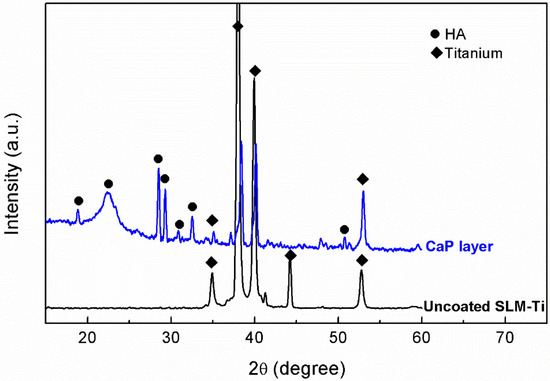 XRD patterns of the coated SLM-Ti scaffolds (Figure 4) revealed the appearance of peaks for apatite CaP (at 2θ = 18.79°, 22.90°, 25.88°, 28.13°, 28.97° and 31.78°). These apatite peaks were not present on uncoated SLM-Ti scaffolds. This analysis suggested the deposited layer on SLM-Ti scaffolds under this experimental condition was hydroxyapatite (JCPDCS # 00-009-0432).