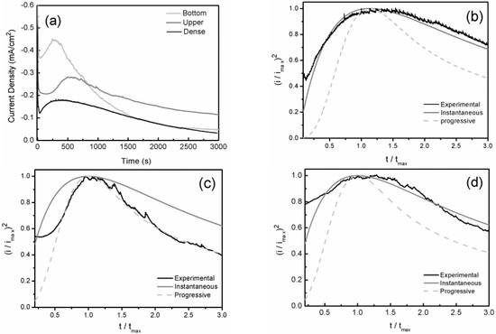 Based on the above discussion (Figure 5 and Figure 6), the nucleation process was diffusion controlled under the experimental condition analyzed here. Theoretical plots for progressive and instantaneous 3D nucleation processes under diffusion control are given by the following equations in terms of the current maximum value (tmax, imax) [25]: