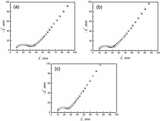 Nyquist diagrams for CaP coating on SLM-Ti scaffolds at deposition time of (a) 6000 s, (b) 3000 s, and (c) 1000 s. ■■■: experimental data and ○○○: fitting result.