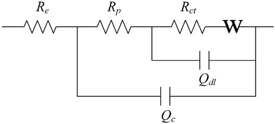 The equivalent circuit used to fit the impedance diagrams in Figure 6.