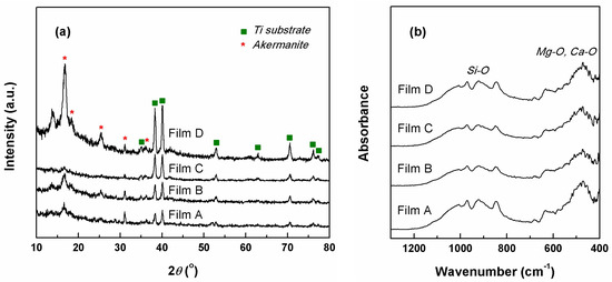 Figure 1a shows the XRD patterns of the four thin films grown by laser ablation on titanium substrates in different experimental conditions (Table 2). As can be seen, the most intense signals are attributed to the metallic supports made of hexagonal titanium (ICDD 00-044-1294) due to the low thickness of the deposited layers. Even though the investigation was carried out at grazing incidence, for most of the samples, only small diffraction peaks assigned to tetragonal akermanite—Ca2MgSi2O7 (ICDD 00-035-0592) were identified. However, in the case of Film D, an increase in signal emerged, which can be associated with the highest values of the variable processing parameters, substrate temperature—350 °C and oxygen pressure—200 mTorr. Another fact that has to be taken into account is related to the shape of the XRD patterns at low angles, with the occurrence of an amorphous halo due to the existence of a short range order in glassy masses; basically, the structural units maintain their periodicity only at the level of the nearest neighbours, while the overall structure is macroscopically isotropic. In this light, it can be stated that the coatings produced are vitroceramic in nature, meaning a vitreous matrix and crystals of akermanite distributed within it.