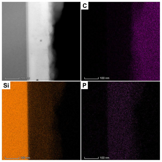 The characterization methods included: grazing incidence X-ray diffraction (XRD) with a PANalytical Empyrean diffractometer (Malvern Panalytical, Royston, UK), with 0.5° incidence angle, 2θ ranging between 10° and 80°; Fourier-transform infrared spectroscopy (FTIR) with a Thermo Scientific Nicolet 6700 spectrophotometer (Thermo Fisher Scientific, Waltham, MA, USA), the wavenumber ranging between 400 and 1300 cm−1; scanning electron microscopy (SEM), coupled with energy-dispersive X-ray spectroscopy (EDX) with a FEI Quanta Inspect F electron microscope (FEI, Hillsboro, OR, USA); transmission electron microscopy both in conventional (TEM) and scanning (STEM) mode, coupled with selected area diffraction (SAED) and electron energy loss spectroscopy (EELS), with a Titan Themis transmission electron microscope (FEI, Hillsboro, OR, USA).