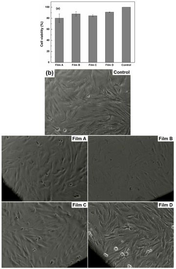 The samples impact on BJ cells viability and morphology are presented in Figure 7. The proliferation of the cells for the tested conditions was checked and plotted in Figure 7a. Using MTT assay, the percentage of viable cells in comparison with Control cells was evaluated. The most toxic effect was produced by Film A, which decreased the viability of the cells with approximately 20%. When BJ cells grew in the presence of Film B and Film C, the corresponding values were 87% and 84%, respectively. The smallest influence was observed in the case of Film D, which only decreased the viability of the cells as compared to Control cells with 9%. However, considering the error bars, all samples are integrated in the same trend, with a low degree of cytotoxic effect.