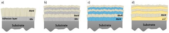 - Marulanda, D.; Olaya, J.; Piratoba, U.; Mariño, A.; Camps, E. The effect of bilayer period and degree of unbalancing on magnetron sputtered Cr/CrN nano-multilayer wear and corrosion. Thin Solid Film. 2011, 519, 1886–1893. [Google Scholar] [CrossRef]