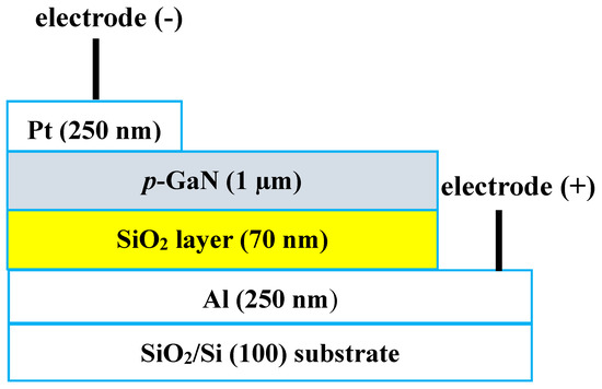 By Hall measurement of the p-Mg-GaN film on the SiO2/Si (100) substrate at RT, the hole’s concentration (Np) and carrier mobility (μ) were found to be Np = 4.32 × 1016 cm−3 and μ = 7.52 cm2·V−1·s−1, respectively. Using SEM, the thicknesses of both the electrodes and the SiO2 layer were found to be 250 and 70 nm, respectively.