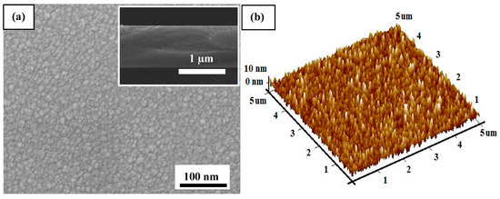 Figure 2a shows the SEM surface morphologies of the p-GaN films sputtered on the SiO2/Si (100) substrate. With EDS analysis results, the ratio of [Mg]/([Ga] + [Mg]) was 10.2% for the p-GaN film. This indicated that the p-Mg-GaN film deposited at 400 °C with up to 10% Mg displayed continuous smoothness without cracks and pores. The inset shows a cross-sectional image, with a thickness of 1 µm for the p-GaN film. Figure 2b shows the surface topography of the as-deposited Mg-GaN films on the SiO2/Si (100) substrate tested by AFM measurement. The surface topography showed smoother and smaller grains and the root-mean-square (rms) roughness of the films was found to be 3.27 nm. The EDS compositions, SEM surface morphologies and XRD patterns of the p-Mg-GaN film obtained with cermet targets at different Mg contents can be found in our previous works [20,21]. The positive surface conditions of Mg-GaN layer together with the insulator SiO2 layer were the important factors for determining the electrical properties of the MOS Schottky diodes.