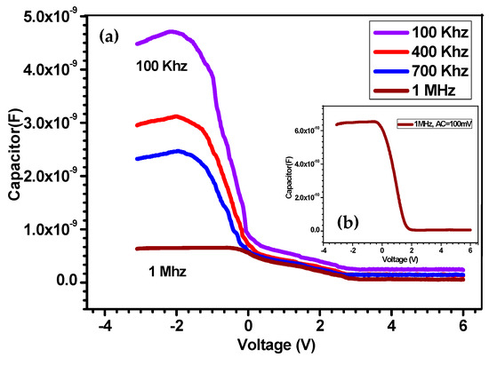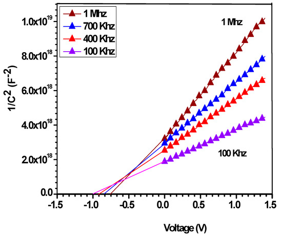 Figure 6a shows the plotted C–V measurement of the MOS Schottky diode tested at the frequency range 100 KHz–1 MHz. The Figure 6b is the electrical properties of the diode, which was measured at a frequency of 1 MHz with an alternating current (AC) modulation of 100 mV. Figure 7 shows the characterization of 1/C2 vs. V as a function of the p-MOS Schottky diode tested at different frequencies. The x-intercept of the 1/C2 vs. V plot determined V0 from the straight lines for the downward region at the reverse bias [4,5,7,11].