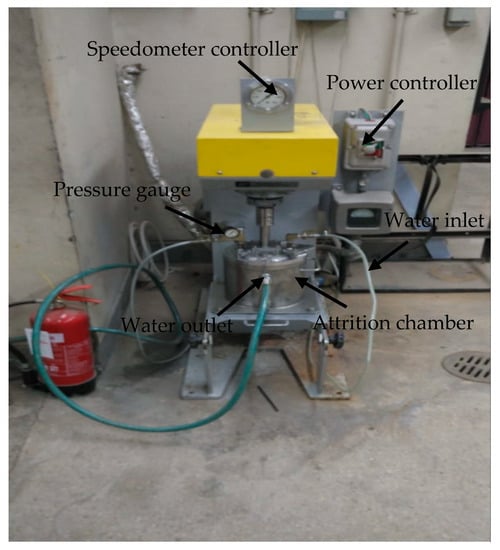 Raw powders of Al (99.95% purity) and Fe (99.95% purity) were used to fabricate the alloys. The average particle size of Al was 5 µm, while the Fe (initial size = 45 µm) was premilled to achieve an average particle size of 13 µm. Before milling, pure Al and a proportionate mixture of premilled Fe (2 wt.%, 5 wt.%, and 10 wt.%) were degassed at 453 K for 24 h under vacuum. The mechanical alloying was carried out in an attritor (Figure 1) with a 5 mm stainless steel ball. The ball-to-powder weight ratio was 30:1 along with 1% of stearic acid powder (process-control agent). The balls and degassed-powder mixtures with the stearic acid were charged into the steel canister (container) of the attritor at 100 rpm, and the speed of the attritor was gradually increased to 250 rpm. Mechanical alloying (Al-2 wt.%, Al-5 wt.%, and Al-10 wt.% Fe) was performed in an inert atmosphere for 4 h. In order to maintain a constant temperature inside the attritor canister (container), we gave a 15 min pause for every 30 min of milling that was followed by a continuous supply of cold water in the outer chamber of the canister.