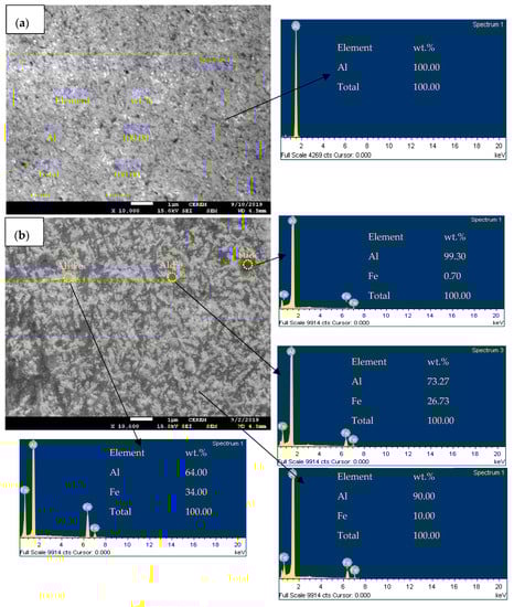 The SEM micrographs with the corresponding EDS analysis (arrow mark in respective figures) of pure Al and Al-10 wt.% Fe alloys after the sintering process are shown in Figure 2a,b, respectively. No porosity is shown in the SEM micrographs of pure Al (Figure 2a) or the Al-10 wt.% Fe alloys (Figure 2b), which indicates the perfect fabrication process with HFIS, as confirmed by the high relative-density values (>98%) of the sintered samples. Pure Al showed 100% Al in the EDS result (Figure 2a) which confirm that there no oxidation occurred during the HFIS process. Due to mixing 10 wt.% Fe in the alloy, dispersion of fine Fe particles in Al matrix was shown with uniform intermetallic distribution [], as shown in Figure 2b. From this figure, it can be observed that the Fe was completely mixed and uniformly distributed in the Al matrix; thus, there was no segregation found []. On the basis of the Al-10 wt.% Fe alloy microstructure, it is possible to say that it formed a homogeneous and uniform mixture without porosity, which may improve the microstructural stability of fabricated alloys.