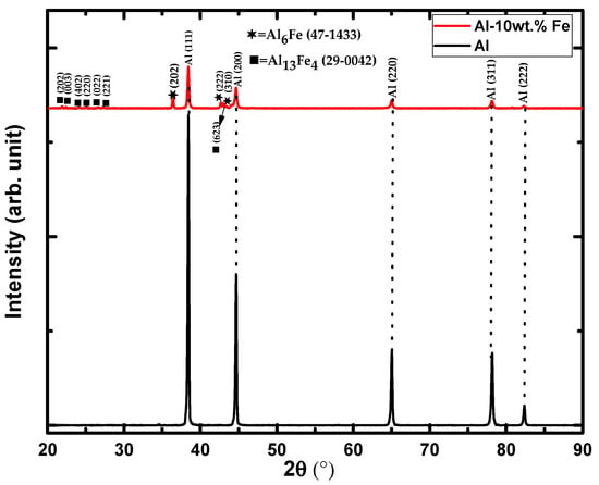 The X-ray diffraction patterns for the pure Al and Al-10 wt.% Fe alloys are shown in Figure 3. For the pure Al sample, the observed diffraction peaks corresponded to (111), (200), (220), and (222) planes of α-Al (JCPS = 85-1327). Peak broadening (after milling and sintering) along with a peak-intensity (height) decrease was observed in the Al-10 wt.% Fe alloys. This might be due to enhanced crystal-size refinement, it being amorphous, and the formation of new intermetallic compounds during MA process with addition of Fe []. In Al-10 wt.% Fe alloy-diffraction peaks, Al6Fe (JCPS = 47-1433) and Al13Fe4 (JCPS = 29-0042), along with the main α-Al peaks, were identified as intermetallic compounds. The formation of intermetallic compounds corroborates the EDS analysis results. These new intermetallic compounds were obtained because, during the milling process, the added Fe was completely mixed with Al and formed a uniform mixture of Al-Fe alloys. During the sintering process, Fe from the mixture was expelled as part of the new intermetallic compounds due to high temperature and pressure. The formation of these new Al6Fe and Al13Fe4 intermetallic compounds occurred during the sintering process at the relatively high temperature of 823 K. Moreover, the presence of Al6Fe and Al13Fe4 intermetallic compounds in the fabricated alloys enhanced the mechanical properties and improved the microstructural stability of the sintered alloys.