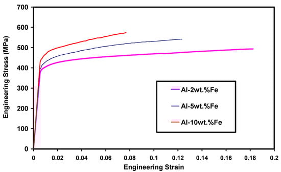 Aluminum and its alloys have recently been used in the automotive industry, aerospace and military fields owing to good mechanical properties such as improved strength, hardness, and a high-specificity elastic modulus [,]. The addition of 5 wt.% Fe in an Al matrix could lead to improvement in the mechanical properties of the alloys owing to grain refinement and the formation of intermetallic compounds such as Al6Fe andAl13Fe4 []. It was reported that transition metals are not freely miscible in Al, for example, the solubility of Fe in Al can reach the maximum level of 0.03%, which delays the age-hardening process [,]. Nonequilibrium processes, such as mechanical-alloying and rapid-solidification techniques, are used to increase the solubility of Fe in an α-Al matrix [,,,,]. Alloys with a higher amount of Fe and improved microstructures show a better physical and mechanical properties compared to an alloy of Al with less Fe content [,,,].