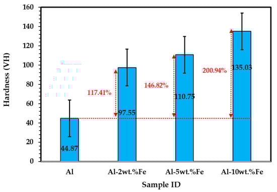Alloy hardness with error is shown in Figure 5. As the amount of Fe increased, the hardness of the Al-Fe alloys also significantly increased owing to the formation of nanocrystalline Al-Fe alloys with crystallite/grain refinement []. The hardness of Al, Al-2 wt.% Fe, Al-5 wt.% Fe, and Al-10 wt.% Fe was found to be 44.87, 97.55, 110.75, and 135.03 HV, respectively. Once the 10 wt.% Fe was added in Al, hardness was increased by more than 200%. This phenomenon occurred due to the influence of grain-size refinement, where crystallite size is decreased after the addition of Fe in Al []. It is well known that the hardness of intermetallic compounds, especially Al6Fe, is greater than that of pure metals or alloys [,]. Alloy hardness can be correlated with intermetallic volume fraction calculated with XRD, where Al-10 wt.% Fe alloys contain 2.32% Al13Fe4 and 15.90% Al6Fe, which play an important role in hardness enhancement.