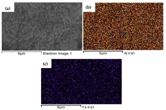 To confirm the uniform dispersion of Fe particles in the Al matrix, EDS elemental mapping was performed using FESEM on the surface of the Al-10 wt.% Fe sintered sample, as shown in Figure 6. EDS mapping of the Al-10 wt.% Fe alloys (Figure 6a) clearly indicated homogeneous dispersion in gray and black contrast due to the presence of Al and Fe/intermetallic compounds []. The black contrast represents Al distribution, since it was represented in the SEM image (Figure 2b), while the gray contrast surrounded the Al matrix by the formation of Fe/intermetallic compounds []. The bright-yellow contrast in Figure 6b represents Al, and the dark contrast indicates Fe/intermetallic presence. Similarly, in Figure 6c, it can be seen that the blue contrast represents the presence of Fe particles, while the black and white particles show intermetallic presence. From EDS mapping, it was clear that Fe particles were homogeneously distributed in the Al matrix of Al-10 wt.% Fe alloys.