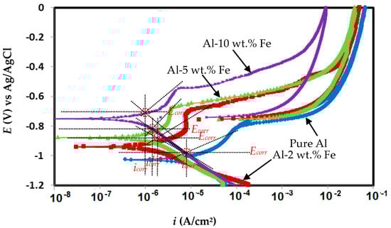 The CP curve showed the active–passive behavior of the pure Al as well as the binary Al-Fe alloys. It was observed that the addition of Fe resulted in an increase in cathodic current density owing to the presence of greater intermetallic compounds that worked as cathode sites where hydrogen-evolution reaction occurred [,]. Moreover, cathodic current density was increased once Fe content was increased in the Al-Fe alloys. Pure Al showed a sudden increment in current density after Ecorr, which showed pitting, whereas, once the Fe was added in the Al-Fe alloys, it formed a passive film after Ecorr. The formation of a passive film in the Al-Fe alloys at lower current density revealed protection against corrosion in the NaCl solution. Passivation was observed once Fe was incorporated in the Al-Fe alloys during anodic scanning at a different current density due to the formation of intermetallic compounds in alloys such as Al13Fe4 and Al (Fe), which is correlated with the results of Flores-Chan et al., where they found that Al-Fe (20 wt.%) alloys facilitate forming a passive film []. It was observed by other researchers that the corrosion protection of Al–Fe alloys is due to the formation of stable passive films (ferrous and aluminum hydroxide/aluminum ions) exposed to NaCl solution owing to the preferential dissolution of FeAl3 [,].