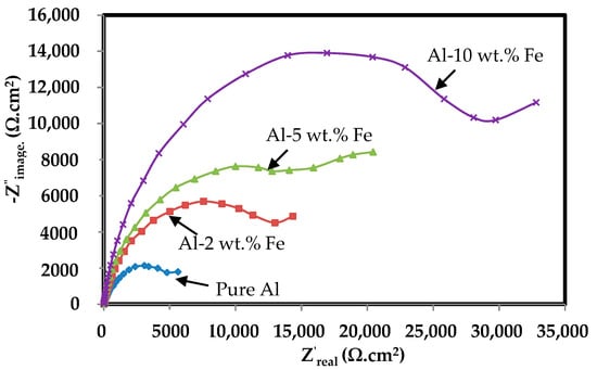Capacitive behavior due to the presence of two time constants, typically as in passive materials, can be clearly noticed from the Bode plot (Figure 10). The phase angle was shifted from −60° for pure Al to −80° for Al-10 wt.% Fe at a middle studied frequency, which revealed the capacitive properties of the film. Shifting in phase-angle maxima in a broad range of middle frequency at −80° revealed that, after exposure to the NaCl solution, the surface became homogeneous and resistive due to the formation of a passive film. This result indicates that there formed a thin, stable layer at the alloy/solution interface that covered the surface of the Al-Fe alloys. Pure Al showed phase-angle maxima at −60°, suggesting that the surface became nonhomogeneous and defective; thus, corrosion resistance was the lowest among all samples.