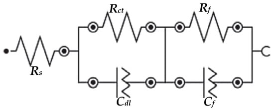 The suitable equivalent circuit model (ECM) is shown in Figure 9 to fit EIS plots and extract the kinetics parameters. This ECM contained two circuits, where the first circuit contained charge transfer resistance (Rct) at the electrode/solution interface and the double-layer capacitance (Cdl), which were parallel with each other. Another circuit contained the layer resistance that was inter-related with the resistance of the corrosion film (Rf) and the capacitance of the film (Cf), which were parallel with each other. Rct with Rf and Cdl with Cf were connected in series with each other. The first circuit represented the corrosion characteristics of the alloys, whereas the second was for film formation at the alloy/solution interface. From the ECM (Figure 8), calculation of electrochemical impedance parameters such as solution resistance (Rs), Rct, Cdl, Rf, and Cf was obtained []. Table 3 shows the value of these calculated parameters. In order to give a more accurate fitting, constant phase elements (CPE) were replaced for the capacitive elements of the corrosion film (CPEf or Cf), pseudocapacitance and double-layer capacitance (CPEdl or Cdl). For various corrosion parameters, it is well known that Rct is the factor that expresses the corrosion behavior of alloys, and its value is inversely proportional to icorr.