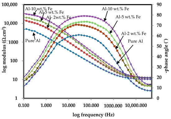 The Bode-phase diagram was obtained during the EIS experiments of the pure Al and Al-Fe alloys after one hour of immersion in 3.5% NaCl solution, and the results are shown in Figure 10. It is clearly observed from this figure that total impedance values were gradually increased once the amount of Fe was increased from 2 wt.% to 10 wt.% at 0.1 Hz. As the Fe amount was increased up to 10 wt.%, corrosion resistance, i.e., total obtained impedance, was the highest due to the presence of the highest intermetallic amount in the Al-10 wt.% Fe alloys, which facilitated the formation of a passive film. It was concluded that the Al-10 wt.% Fe alloy had the highest impedance value; therefore, it gave the best resistance against corrosion. This trend implies that there was a proportional relation between increasing the percentage of iron content in the Al matrix and the corrosion resistance of the Al-Fe alloys.