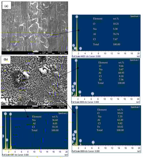 SEM micrographs of the corroded pure Al sample surface after one hour of immersion in 3.5% NaCl solution are shown in Figure 11a. This figure indicates that the Al sample surface was mostly corroded with pit formation as well as flakes and crackers due to the localized attack of chloride ion on the Al matrix []. Pit formation on the surface was correlated with the CP results where anodic current density increased dramatically after Ecorr. EDS analysis (arrow mark from Figure 11a) showed 76.74% Al, 10.21% O, 5.38% Na, and 7.67% Cl on the corroded surface. The reduction in the amount of Al from 100% to 76.74% was due to the deterioration of the pure Al sample. The most possibly corrosive product was the development of an aluminum oxide/hydroxide layer with NaCl deposition on the surface. Aluminum oxide/hydroxide layer acts like a protection film that protects the surface from corrosion.