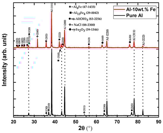 XRD pattern of pure Al and Al-10 wt.% Fe alloys after 1 h of exposure in 3.5% NaCl solution.
