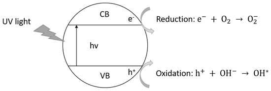 Additionally, the TiO2 semiconductor material can also degrade organic compounds through dissimilar oxidation reactions that, ideally at the last stage, lead to the formation of carbon dioxide and water (Equation (7)). The chemical reaction shown below can be extended to other organic materials such as oil and greases [11], for example, and/or bio microorganisms [41].