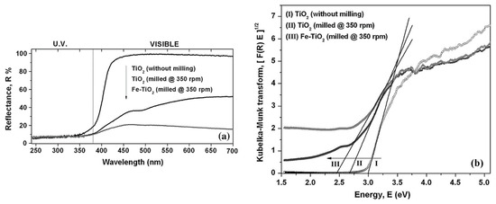 After acquisition of the TiO2 reflectance curve (reflectance (R) versus wavelength), the Kubelka–Munk function can be expressed as F(R) = (1 – R)2/2R and the Kubelka–Munk transform is given by [F(R) × E]½ in which E corresponds to the incident photon energy (see Figure 2b). Taking the curve shown in Figure 2b, the value of the energy band gap was calculated by drawing a line tangent to the curve (drawn from the curve’s inflection point) to its intersection point with the energy horizontal axis. Such an intersection point corresponds to the Eg value. For this specific case, the Eg value for TiO2 without milling, milled with and without Fe powder was 3.0, 2.68, and 2.45 eV, respectively. These results, that is, the changes on the TiO2 energy band-gap, showed that the milling process, as well as doping of the semiconductor by a transition element (iron), influenced the semiconductor’s optoelectronic properties [42].