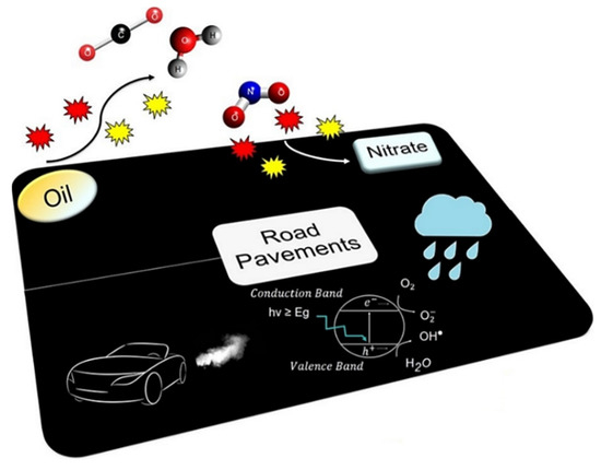 Heterogeneous photocatalysis mediated by semiconductors has recently attracted significant interest due to its efficient capacity to convert solar energy into chemical energy, mainly in applications devoted to the field of environmental remediation. Several research studies achieved good and promising results related to the degradation of different pollutants emitted by fossil fuels used by road vehicles. Due to the huge surface area of photocatalytic road pavements and its vicinity to the exhaust gases from automobiles, they are quoted as promising surfaces for the reduction (in the presence of sunlight and moisture/O2) of SO2, NOx, COx, HC, soot fouling and other volatile organic compounds (VOCs) present in the atmosphere [6,7,8,9,10,11,12,13]. Since in the presence of light irradiation, photocatalytic materials can degrade organic pollutants (such as oils and greases) adsorbed to their surface, these materials can also be classified as self-cleaning materials, a very important property in road engineering applications, because the self-cleaning function can contribute to a significant reduction of car accidents on oil-spilled areas.